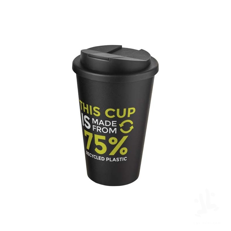Double-walled tumbler made from recycled plastic, with a twist-on spill-proof lid and black inner layer. The tumbler is 75% recycled in total, with a recycled mug and standard lid. The lid clips closed to better prevent spillages, and is manufactured without silicone for a fully recyclable mug. Due to the nature of recycled plastic, there may be small marks or some colour variation. EN12875-1 compliant, dishwasher safe, and microwave safe. The tumbler has a volume capacity of 350 ml and is fully recyclable. Made in the UK. Packed in a recycled PE plastic bag. BPA-free.