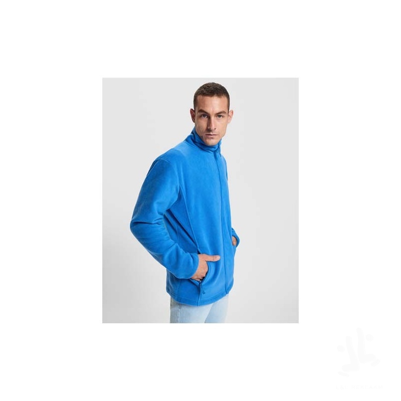 Fleece jacket with high lined collar and matching reinforced covered seams. Injected zip with matching puller made of fabric. Side pockets. Cuffs with elastic trim. Bottom hem with inner side adjusters. Removable label. The model is 185 cm and is wearing size M.