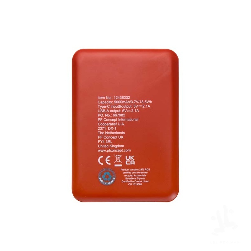 Power bank with slim and elegant design and Type-C in/output port and 2x USB-A ports which means that 3 devices can be charged simultaneously. The power bank features a 5000 mAh lithium polymer battery which delivers a total output power of max. 10W. This power bank is made of 23% RCS certified recycled plastic. Delivered with a TPE Type-C to USB-A charging cable.