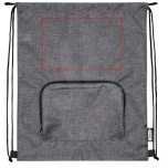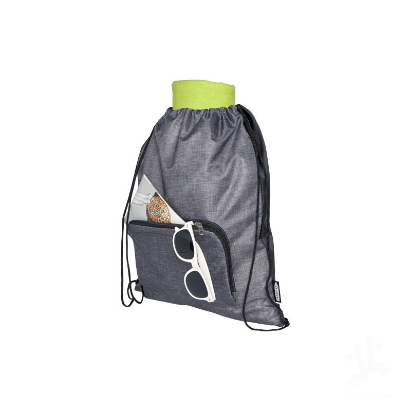 The Ash foldable recycled drawstring bag features a main compartment with cinch closure, and a zippered front pocket that the bag can easily fold up into for easy transport and storage.