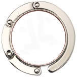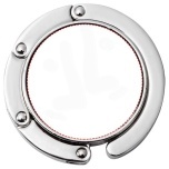 Foldable bag hanger which keeps a bag clean and safe. Hanger can be attached at the edge of a surface and can hold up to 4.5kg.