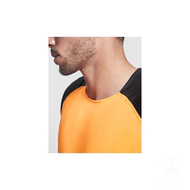 Technical and breathable fabric. Crew neck with matching covered seams. Raglan sleeves and contrasting side panels. Removable label...