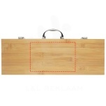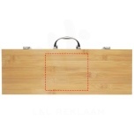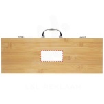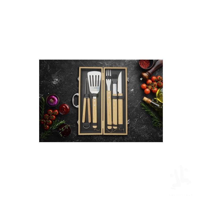 Bamboo 5-piece BBQ set with a shovel (40 x 9.5 cm), tong (34.5 x 6 cm), fork (38.5 x 3 cm), knife (38.5 x 3 cm), and brush (38 x 4.3 cm). The set is delivered in a bamboo gift box (46 x 16.2 x 7.4 cm). The handles and gift box are made of bamboo that is sourced and produced following sustainable standards.