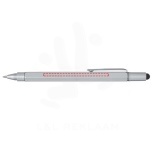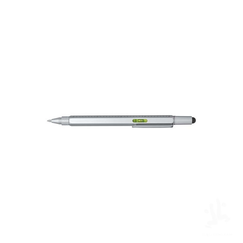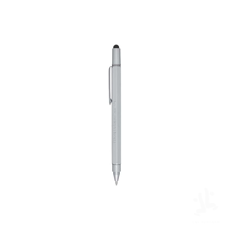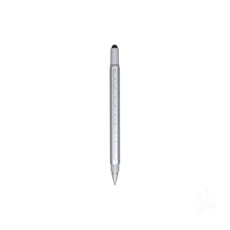 The Dora aluminium multifunctional ballpoint pen is partly made of recycled materials, and features a double sided ruler, lever, screwdriver, gradienter, and a black stylus made of rubber. The barrel is made of recycled aluminium with a silver spray coating. The clip is made of iron. The screwdriver is made of steel. The top part and tip are made of RABS. Ink colour: Black. Writing length: 400 metres. Nib size: 1.0 mm.