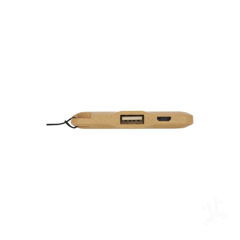 Biodegradable and compact power bank with a handy loop for easy attachment. Charging cable included. Input: DC 5V/800mA. Output: DC 5V/1000mA. Battery: Lithium-ion Polymer.