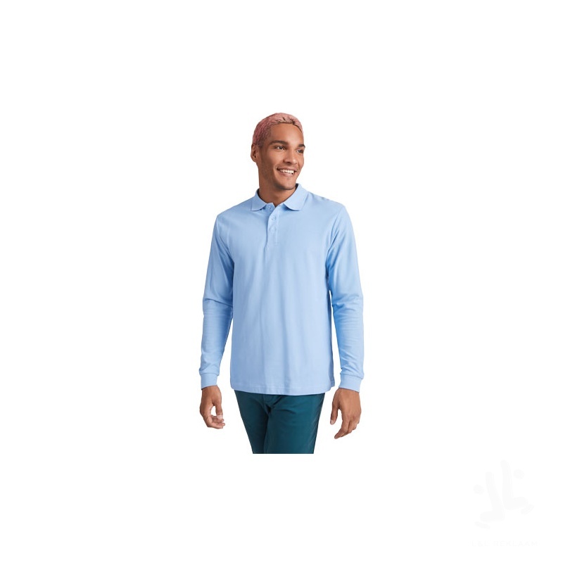 Long-sleeve polo shirt with ribbed collar and cuffs, 3-button placket and elastane 1x1 ribbed cuffs. Reinforced covered seams in collar. Optional pocket. Removable label. The model is 190 cm and is wearing size L.