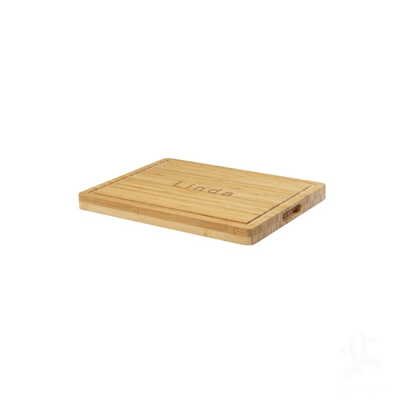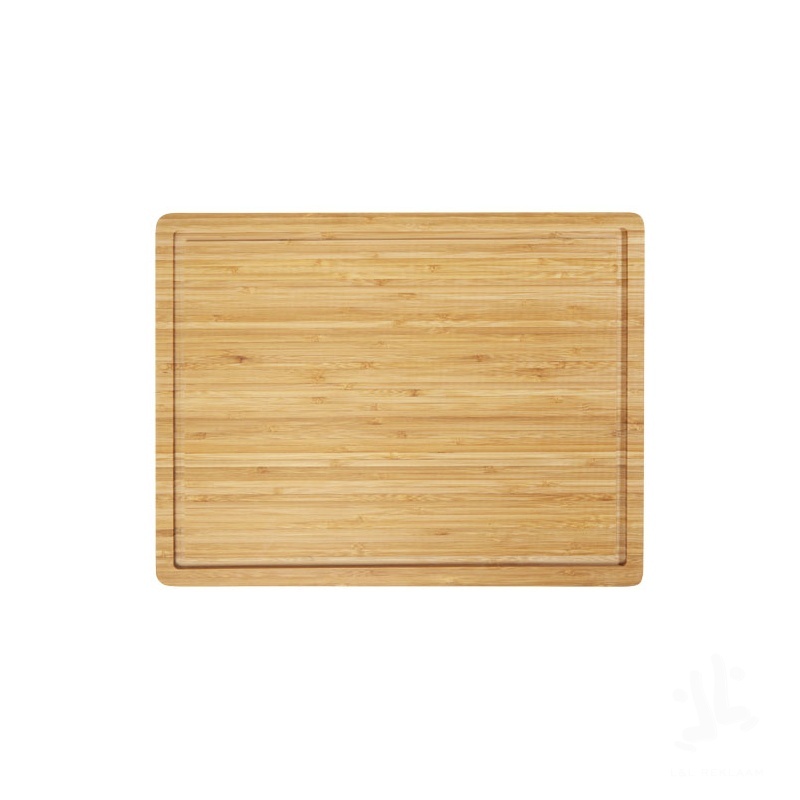 Bamboo steak cutting board with a groove around the perimeter to prevent any liquid from spilling all over the counter. The cutting board is made of bamboo that is sourced and produced following sustainable standards.