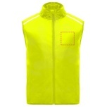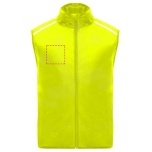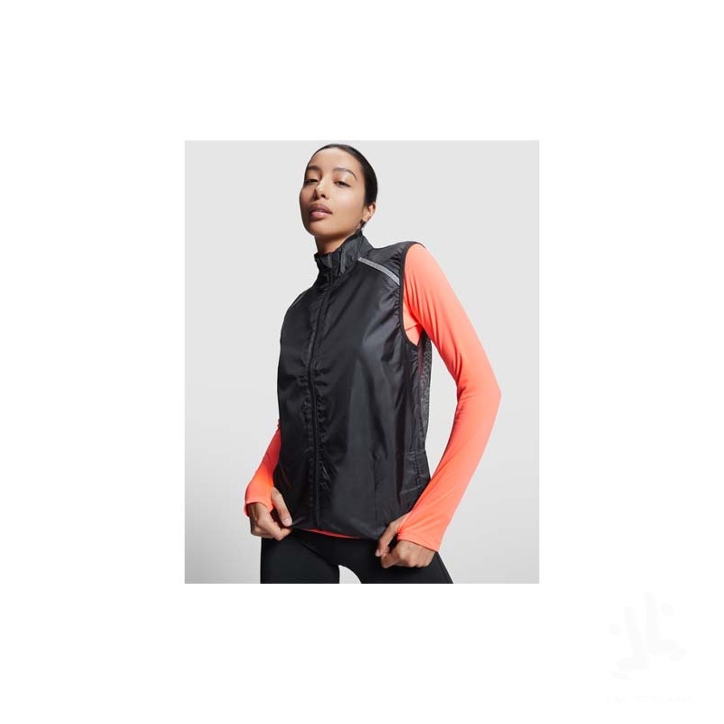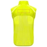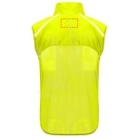 Wind-proof and breathable. Front zip with matching chin protector. Elastic binding at armhole and bottom. Bottom part of the back in microperforated fabric. High-visibility details on the top, front and back. Pocket with elastic strap to stow the vest and wear it on the wrist. Removable label.
