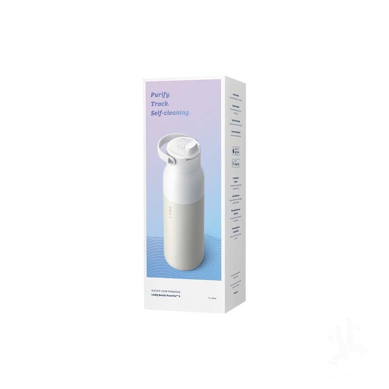 The LARQ PureVis™ 2.0 water bottle is a 1000 ml all-in-one self-cleaning and water-filtering bottle with smart hydration tracking. It enhances water quality through a 2-stage filtration and UV-C purification process, delivering cleaner, better-tasting water. The UV-C LED in the cap activates automatically every two hours to keep the bottle clean and odour-free, or you can manually start a PureVis™ cycle at the touch of a button. With a long-lasting battery, the bottle runs for up to 2-3 weeks on a full charge via the USB-C port. The cap features a built-in, detachable soft-touch handle for convenient carrying. Smart sensors track your water intake automatically, while the LARQ app provides insights and progress. Filters should be replaced regularly for optimal performance.