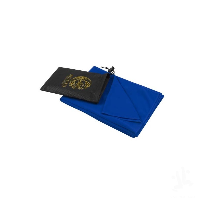 The Lucas RPET sport towel is made from 100% recycled polyester, offering a soft and absorbent surface ideal for training or outdoor activities. With a weight of 140 g/m², it strikes a balance between durability and lightweight comfort. The towel features a practical plastic cord to secure both the towel and pouch, making it easy to carry and store. Delivered with a non-woven pouch (13 x 18 cm), that is also made of 100% recycled polyester. Towel size: 50 x 100 cm.