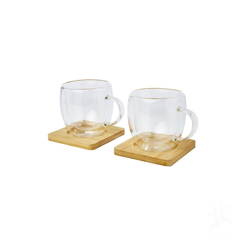 A set of 2 double-wall thermal glasses with bamboo coaster. The bamboo comes from sustainable, environmentally, and socially responsible sources. Thanks to the double borosilicate glass, the temperature of the drink is retained for a long time. Volume capacity is 250 ml. Coaster size: 10 x 10 x 1 cm.