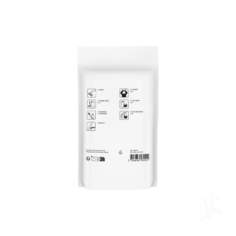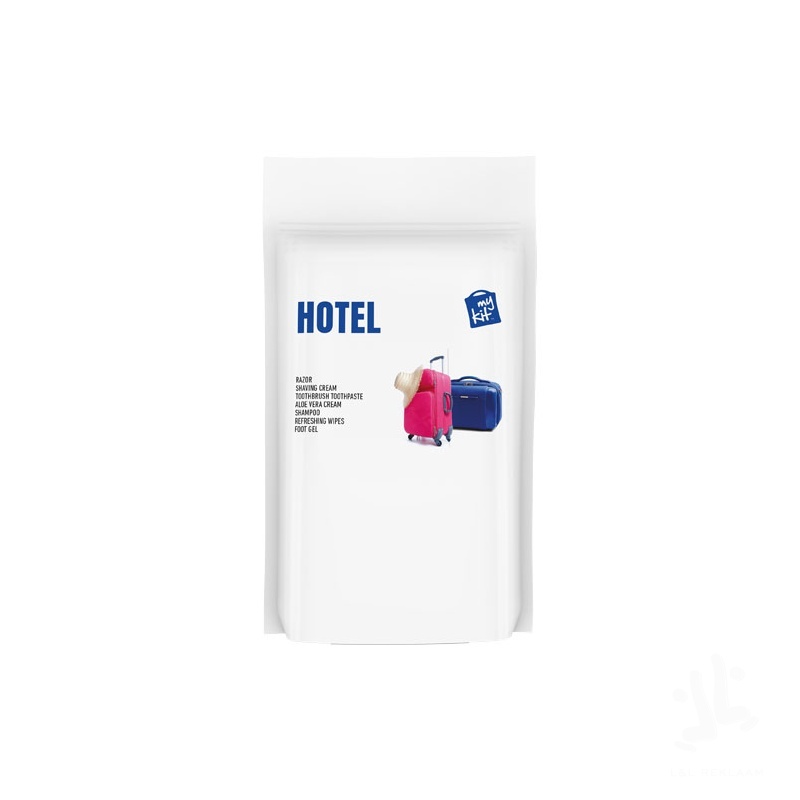Hotel kit with all necessities for on-the-go, ideal for business travel or long exhibition days. Contents: 1 razor, 1 shaving gel, 1 Aloe Vera cream, 1 shampoo, 1 foot gel, 1 nail file, 1 toothbrush and 1 toothpaste. All of the first aid and care products in the kit meet all applicable EU regulations. Price includes full colour print. Delivered in a paper pouch.