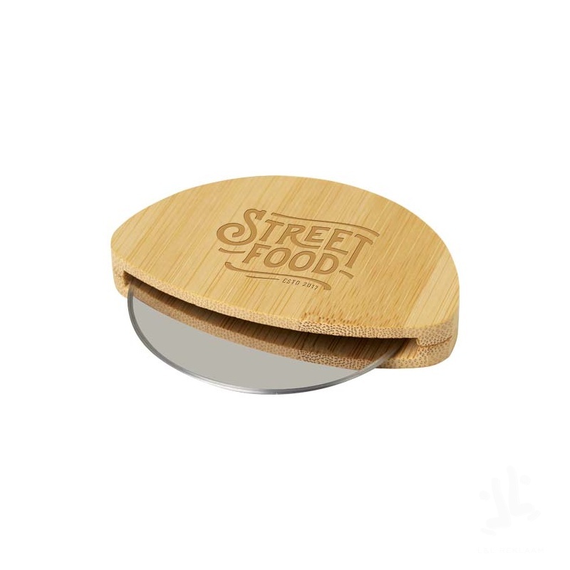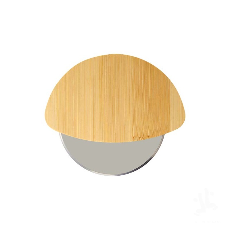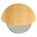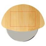 Pizza cutter with bamboo handle and stainless steel blade.
