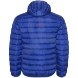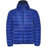 Men's feather touch quilted jacket with fitted hood. Inverted zips with matching chin protector. Two front pockets with zip. Matching elastic trim in cuffs, hem and hood. Contrasting inner lining. Light and foldable garment. Water resistant. Wind-proof model.