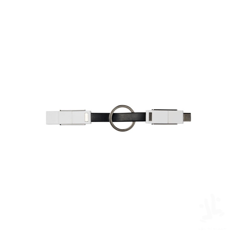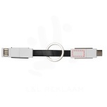 A 4-in-1 cable that covers all charging needs in one package. It features a USB type A, Type-C, and a 2-in-1 tip that is compatible with both iOS and Android devices. It can be used for charging and data transfer. Comes with a keychain and has magnets for convenient carrying.