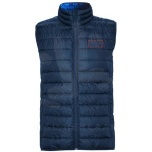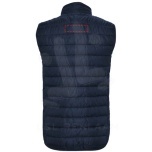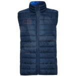 Gilet vest with feather touch filling. Inverted zips with matching chin protector and puller. Two side pockets with zip. Elastic trim in hem and armholes. Contrasting inner lining. Light and foldable garment. Water resistant. Wind-proof model.