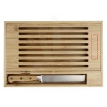 Bamboo cutting board including a bread knife with bamboo handles. The horizontal open pattern allows crumbs to fall through to the tray below, keeping your workspace or dining table crumb-free. Knife size: 34 cm x 3 cm. The bamboo was sourced and produced following sustainable standards.