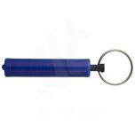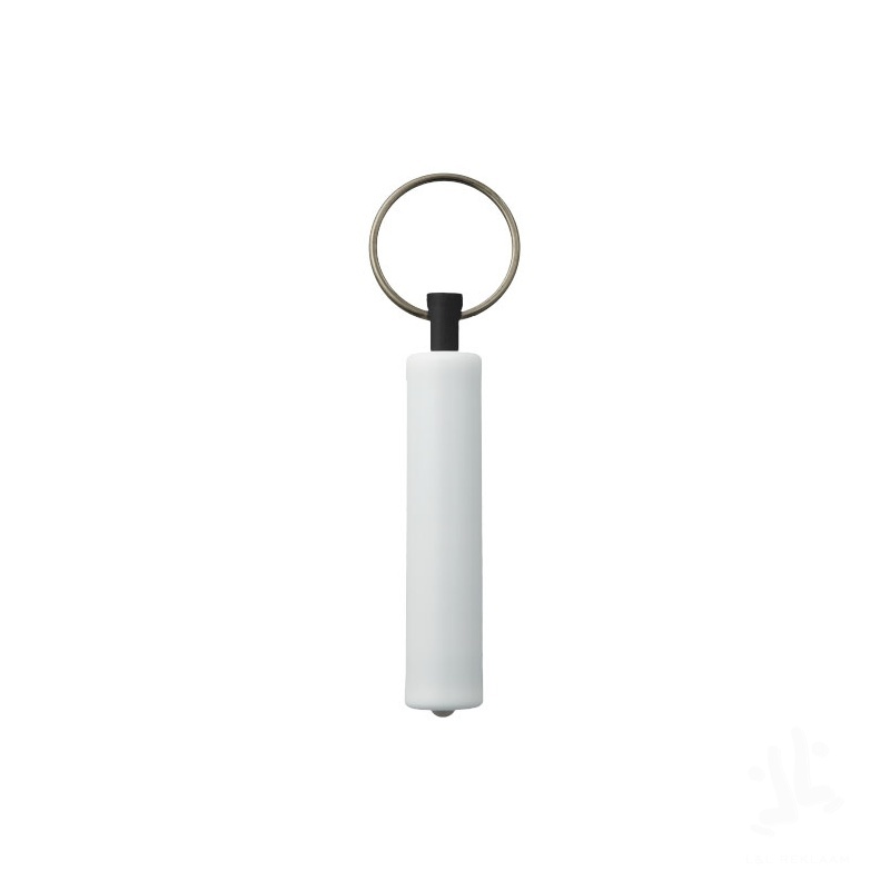 Single white LED light controlled by a push-button power switch. Metal split key ring. Batteries included.
