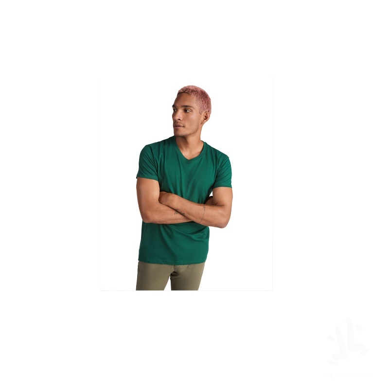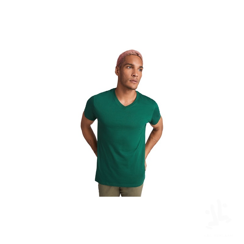 Tubular short-sleeve t-shirt with 2-layer v-neck. Reinforced covered seams in collar and shoulders. Removable label. The model is 190 cm and is wearing size L.