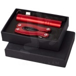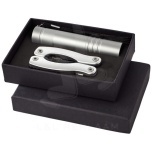 11 function mini multi tool with LED flashlight in black carton gift box with EVA inlay. Batteries included.