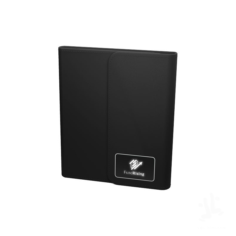 A5 notebook portfolio with light-up logo that offers 5W wireless charging with its 4000 mAh integrated powerbank. The portfolio has a size of 16.5 x 23.5 x 2 cm when closed and the notebook carries 30 pages from sustainable, environmentally and socially responsible sources. The portfolio is made from PU plastic with a microfibre finish and features a 3-in-1 (type C, micro USB, iPhone) charging cable made from recycled PET. The light-up logo is applied on the magnetic closure on the front and the portfolio is packed in a black gift box (24 x 20 x 3.9 cm). Includes 3 year warranty.