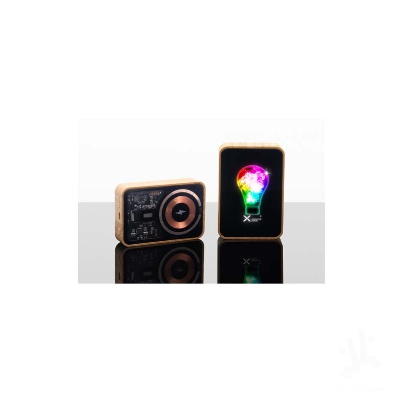 15W MagSafe 10.000 mAh power bank with bamboo finish, featuring a powerful 20W Type-C output (PD fast charge). It comes with a 3-in-1 charging cable compatible with Type-C, Android, and iPhone devices, allowing you to charge multiple devices simultaneously. For phones without built-in MagSafe technology (iPhone 12 and newer), a magnetic ring is included. The power bank is customisable with either an offset light-up logo or a laser engraved light-up logo. Delivered in a gift box.