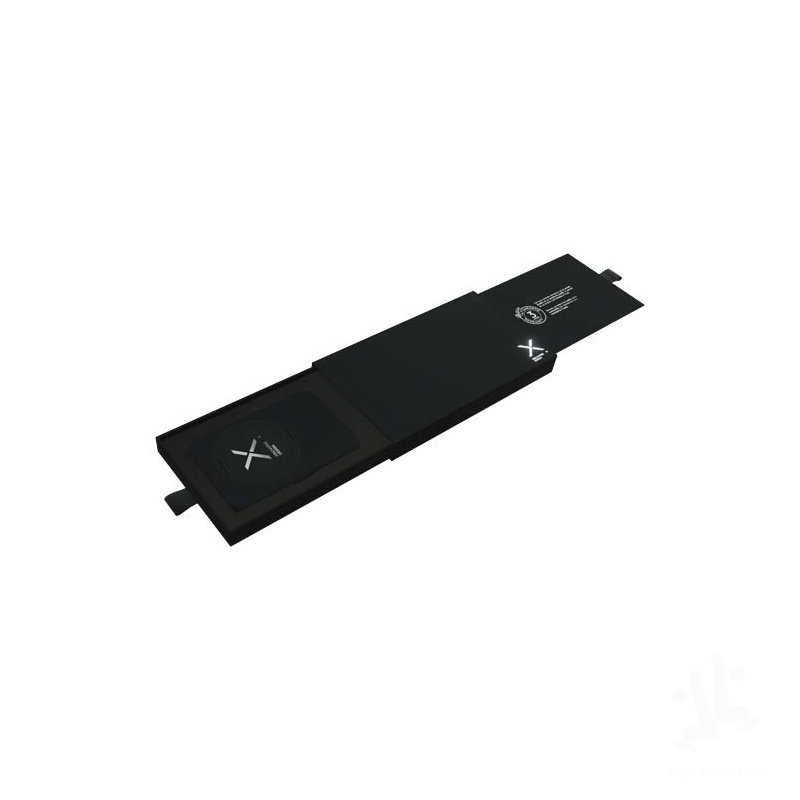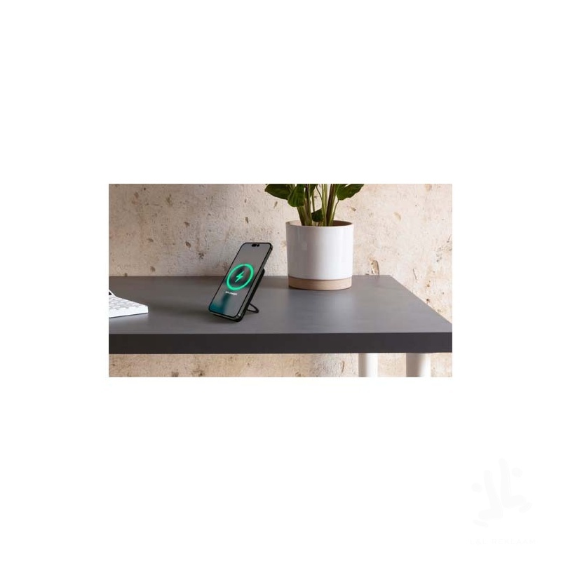 Slim 5000 mAh power bank with MagSafe technology, made from recycled aluminium and recycled plastic. It features a front-facing digital display showing the battery level as a percentage. A foldable ring stand allows the phone to be positioned vertically or horizontally for optimal use while charging. For phones without built-in MagSafe technology (iPhone 12 and newer), a magnetic ring is included. The power bank is customisable with a laser engraved mirrored logo, and is delivered in a recycled cardboard sliding gift box.
