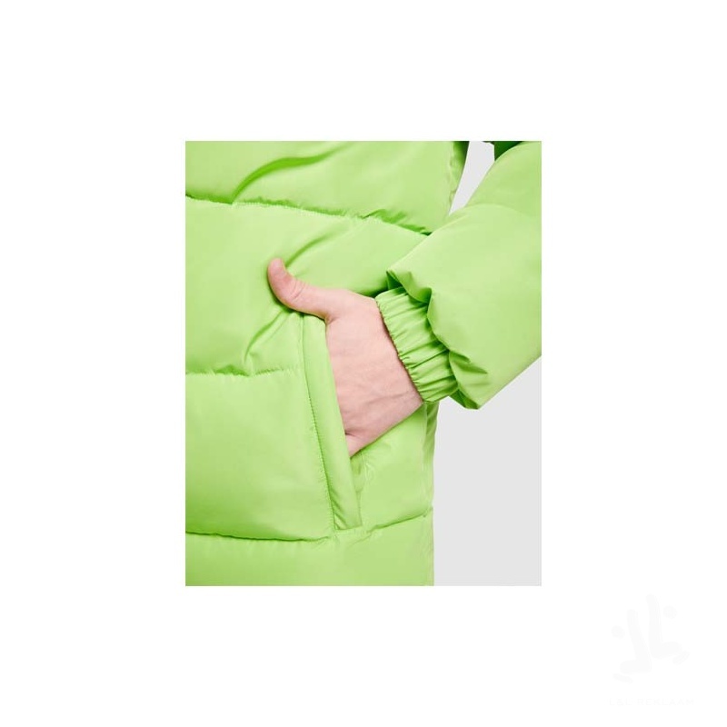 Padded jacket with fixed hood. Front zipper covered with a placket. Chin guard. Two side pockets with zip. Elastic cuffs.