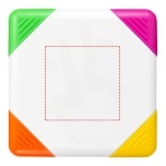 Square-shaped highlighter with chisel tip in yellow, orange, pink and green. Warning! Not suitable for children under three years. Small parts. Choking hazard.