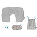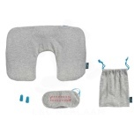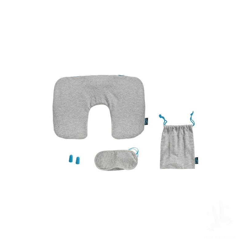 Soft travelset contains an inflatable neck pillow with bright blue zipper, eyemask with bright blue elastic, bright blue soft earplugs and a soft pouch with bright blue drawstring closure.