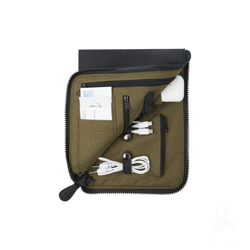 The Turner organiser clutch is designed with highly durable and sustainable materials. The outside is made with 51% GRS recycled PU plastic and the lining is made of 100% GRS recycled RPET. This organiser does exactly what the name promises, there is a dedicated compartment for every need. Whether it is cables, air pods, cards, keys - you name it and it will have a place! With a zipper opening on both sides of the clutch, it is easy to reach every item stored inside. This organiser clutch is made to last, and with its classic design and sturdy materials, it will become a favourite.