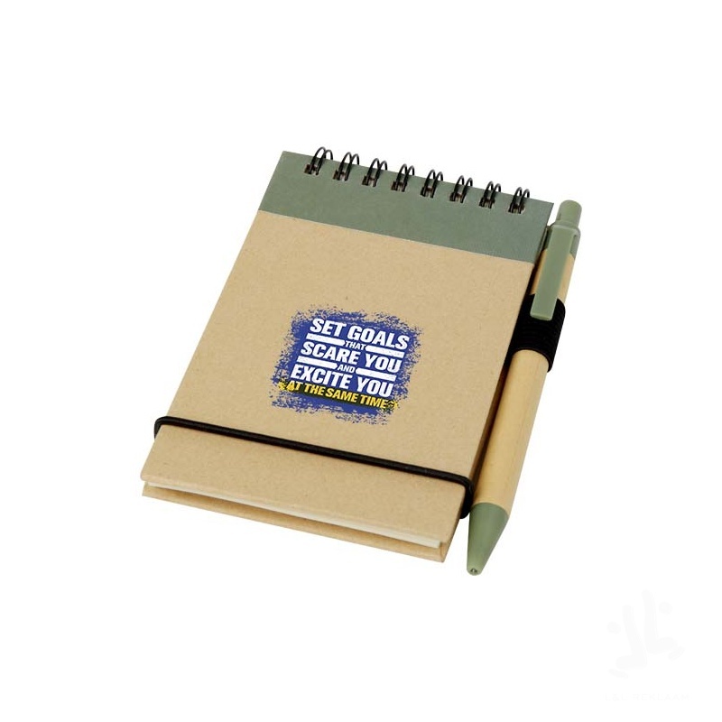 Jotting down quick ideas is made easy with the Zuse recycled jotter notepad with a pen in matching colour. The small jotter notepad contains 60 lined sheets of A7 reference recycled paper, so it fits well in any small or large bag, is easy to hold and besides all: a sustainable choice. Various printing options are available for displaying any logo on the hardcover exterior.