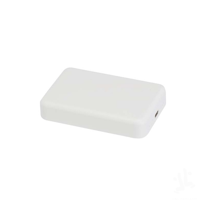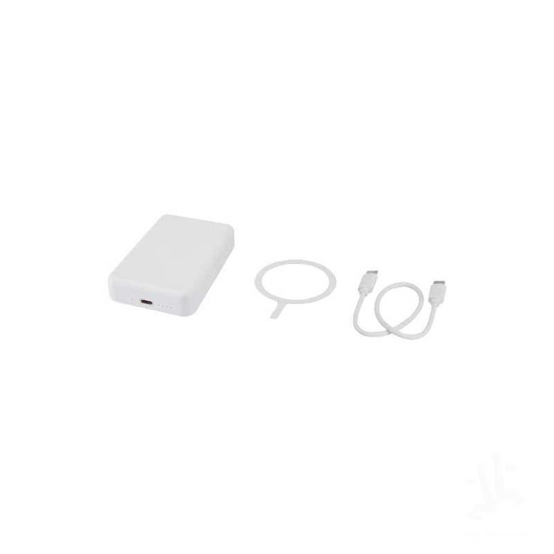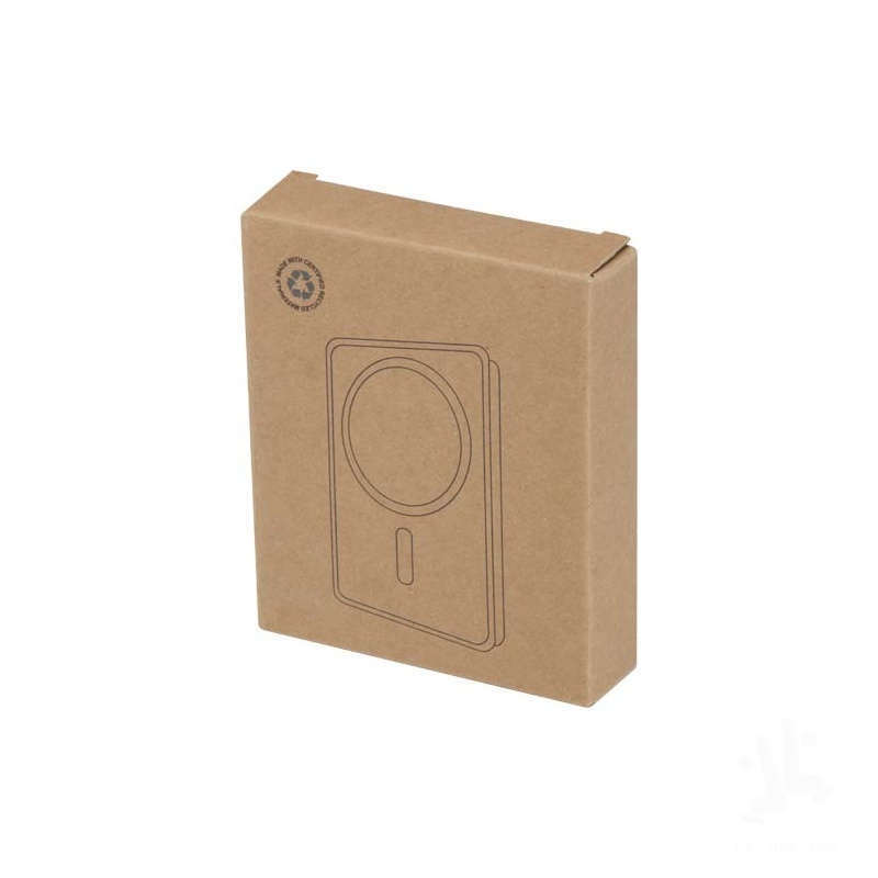 Charge smarter and faster with the compact Acrab 10.000 mAh power bank, made from recycled plastic. Enjoy up to 15W magnetic wireless charging for compatible smartphones, including iPhone 12 and newer. For other wireless charging-enabled devices without magnetic function, a metal ring sticker is included for secure alignment. The power bank also supports 20W wired Type-C fast charging, and the ability to charge two devices at once (wireless and wired), making it perfect for staying powered up on the go. A LED indicator keeps you updated on the charging/battery status.