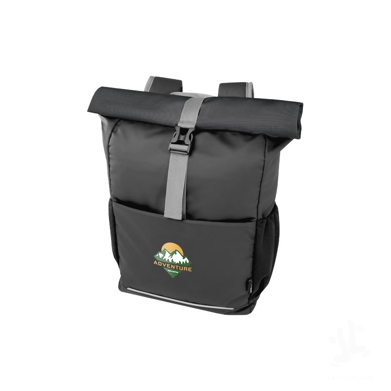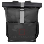 Water-resistant roll-top bike bag made from GRS certified recycled materials. It features a padded 15" laptop compartment, multiple organisational pockets, adjustable hook & loop closure for easy fitting onto a variety of bikes, and reflective piping for visibility. The GRS recycled materials include the main fabric, lining, webbing, and zips. Capacity: 20 litres. PVC free. GRS certified recycled polyester.