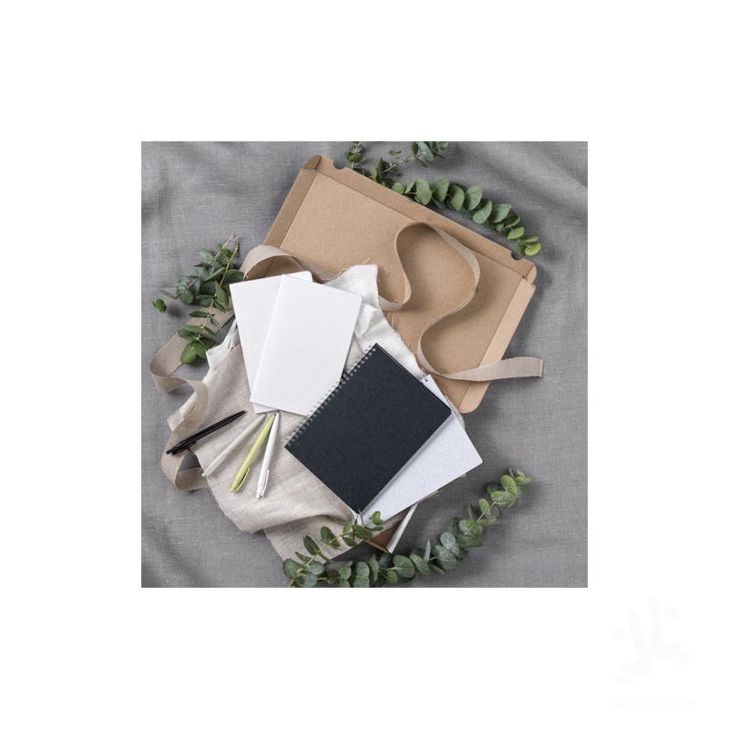 A5-suuruses märkmik, mille kaaned on valmistatud 15% puuvillajäätmetest ja 40% tarbimisjärgsetest taaskasutatud jäätmetest. Märkmikul on 80 punktiirlehte, 80 g/m2, mis on valmistatud 100% vastutustundliku päritoluga taaskasutatud paberist.