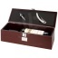 Wine box with bottle stopper and waitress knife. Presented in a gift box and including logo plate. Wine bottle not included. Exclusive design. Wood, Metal.