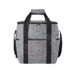 Large cooler bag made of high quality soft and durable GRS certified recycled felt. Features a large main compartment (six 1.5 litre bottles) lined with food safe and extra thick high density thermal PEVA insulation keeping beverages and refreshments cold for hours. Top zipper closure, front pocket, and two side pockets for extra storage. Adjustable long cotton woven shoulder straps (55 x 3.8 cm) and 2 woven cotton carry handles (25 x 3.8 cm) with top hook & loop closing. Easy to clean. Capacity: 21 litres.