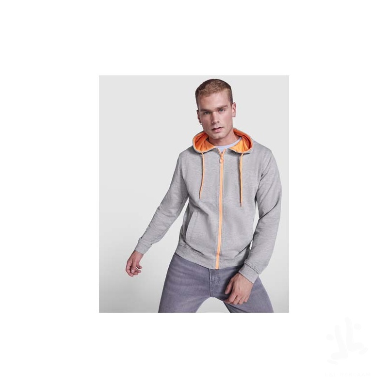 Sweat jacket in non-brushed fleece with details in fluor colour. Central zip with contrasting puller. Hood with lining in microperforated polyester fabric and contrasting fluor colour. Drawcord and metal eyelets in contrasting fluor colour. 1x1 rib in cuffs and waist. Two front pockets with wide trim. Reinforced covered seams on inner collar. Removable label. 60% Cotton and 40% Polyester, 280 g/m2.