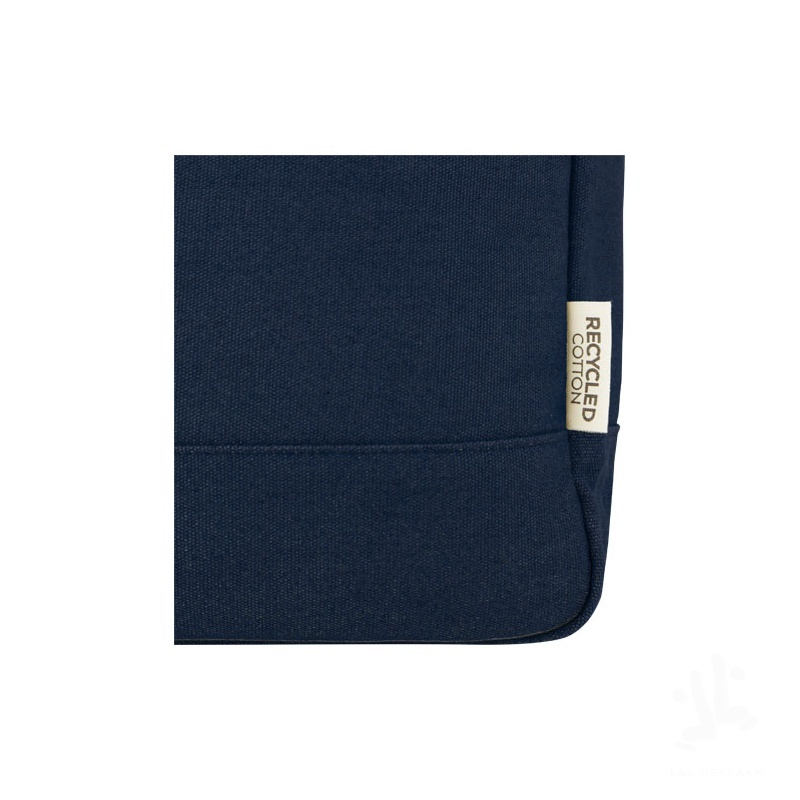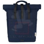 Composed with highly durable and sustainable materials, GRS recycled canvas and GRS RPET lining, the Joey retail-inspired rolltop backpack features a dedicated tablet sleeve along with a 15" padded laptop compartment. The backpack also has 2 side water pockets and one zippered large front pocket, as well as a zippered rolltop opening for maximum storage and safety. The 2 reinforced webbing handles makes it easy and comfortable to carry around as a business tote. The decorative metal plate can make a logo shine through its subtle and matt finish. 80% GRS certified recycled cotton and 20% Cotton, 330 g/m2.