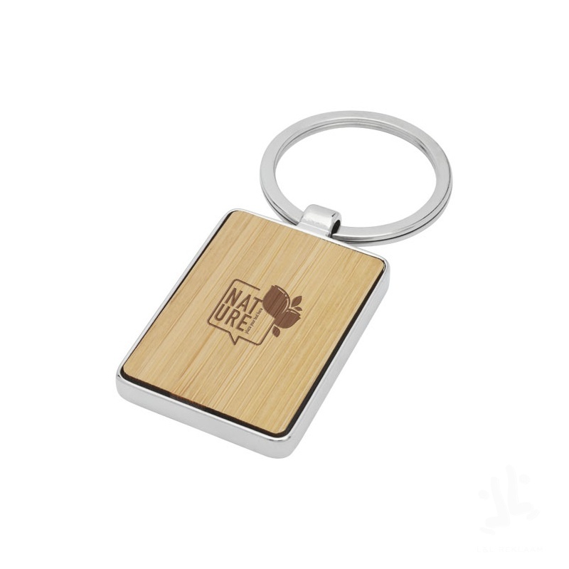 Bambusest valmistatud neljakandiline võtmehoidja tsingisulamist raamis koos pruuni värvi taaskasutatud Kraft paberist ümbrikuga. Võtmehoidja mõõdud 5x3 cm. Lasergraveerimiseks. 90% bambus, 10% tsingisulam.