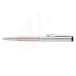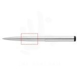 Läbipaistvast plastikust pastapliiats hõbedase metallist klambri ja kummist käepidemega.