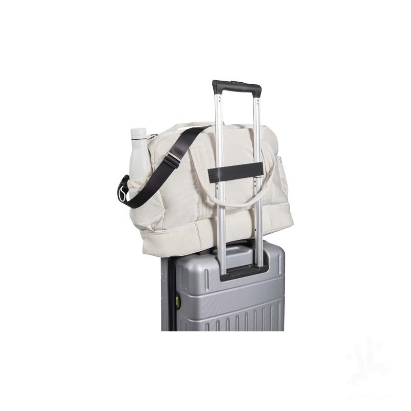 The Puffer duffel bag combines a distinctive design with premium GRS certified recycled materials for everyday practicality. With a 30 litres capacity, it is perfect for short trips, gym sessions, or daily use. The bag features a large zipped main compartment for clothes and gear, an insulated PEVA-lined bottom compartment for separating wet and dry items, and multiple interior and exterior pockets for organisation. A trolley strap, adjustable shoulder strap, and grab handles provide versatile carrying options. Lightweight and water-repellent, this duffel bag is designed to adapt effortlessly to your lifestyle.