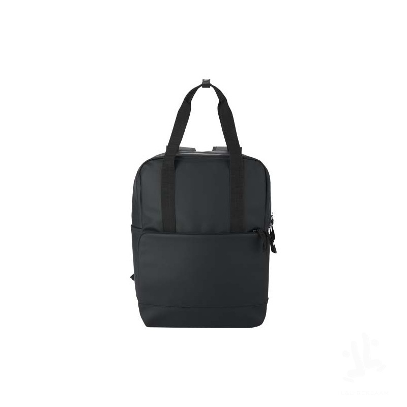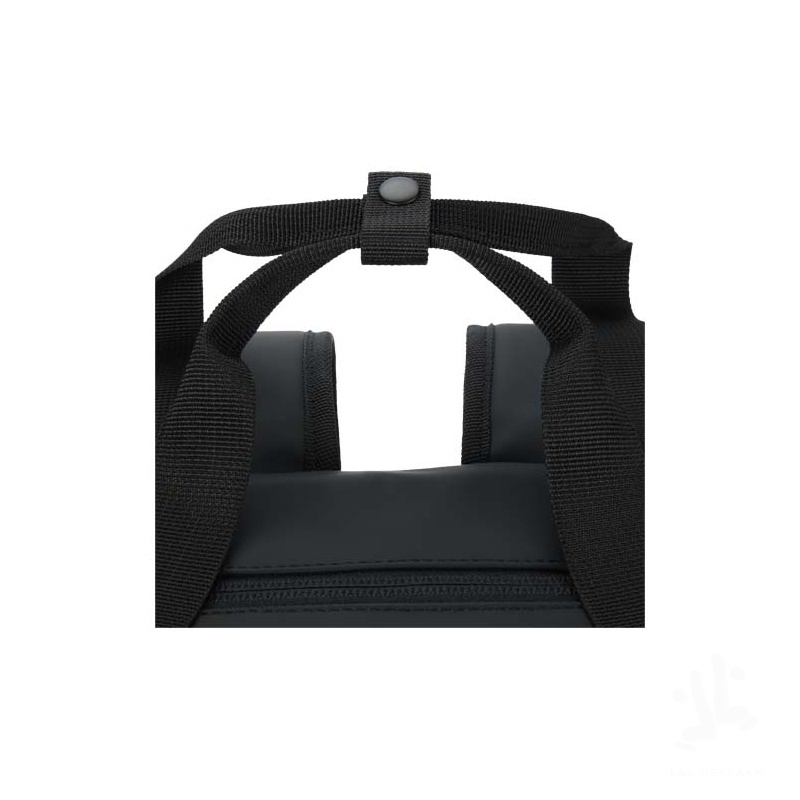 Made from GRS certified recycled PU leather with a matching RPET lining, this 18-litre backpack cooler backpack is designed for outdoor adventures. The spacious main compartment is insulated with high-quality PEVA lining and thick PE foam to keep food and drinks cool, while elastic webbing loops securely hold a bottle of wine. A large padded front zip pocket provides extra protection, and an open side pocket offers quick access to a drink bottle. For comfort, the bag includes breathable mesh on the back and adjustable and padded shoulder straps. Perfect for picnics, beach trips, and camping.
