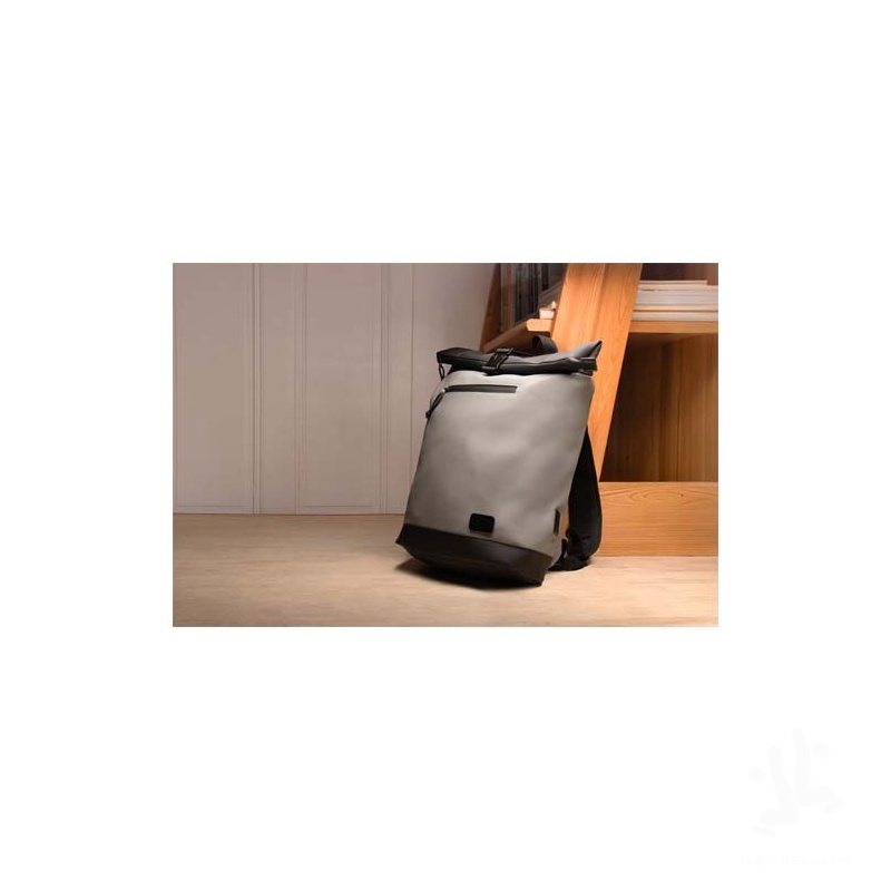 Backpack with a pocket on the front and a waterproof zipper, and padded compartments for a laptop or tablet. The backpack has a non-deformable structure and padded bottom for good protection of the bag contents. Delivered in a non-woven storage pouch. Recycled Plastic.