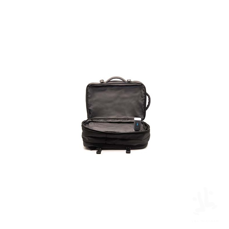 This innovative and versatile travel backpack is designed to maximise packing efficiency and convenience. With its built-in waterproof vacuum system, it reduces the volume of your clothes, allowing you to optimise space while staying organised. Its compact size meets most airline hand luggage requirements, making it perfect for seamless travel. The backpack is crafted from recycled PU and PET materials, and features a padded laptop compartment, two outer pockets, a secure back pocket, and a non-woven storage pouch (55 x 59 cm). For added convenience, the backpack is equipped with an internal USB-A/Type-C connector to connect to a power bank, and external USB-A/Type-C ports to connect a charging cable.