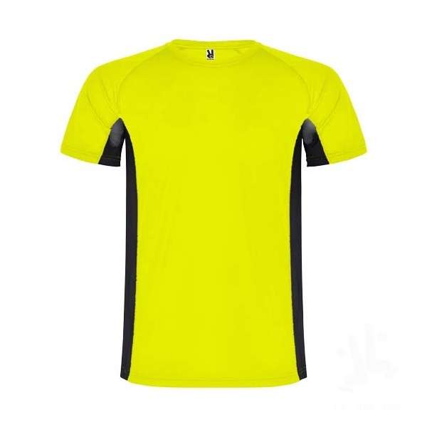 Technical and breathable fabric. A combination of two polyester fabrics: Main fabric in birds eye, side panels and inner sleeve in microperforated fabric. Crew neck with inner reinforced covered seams. Removable label.