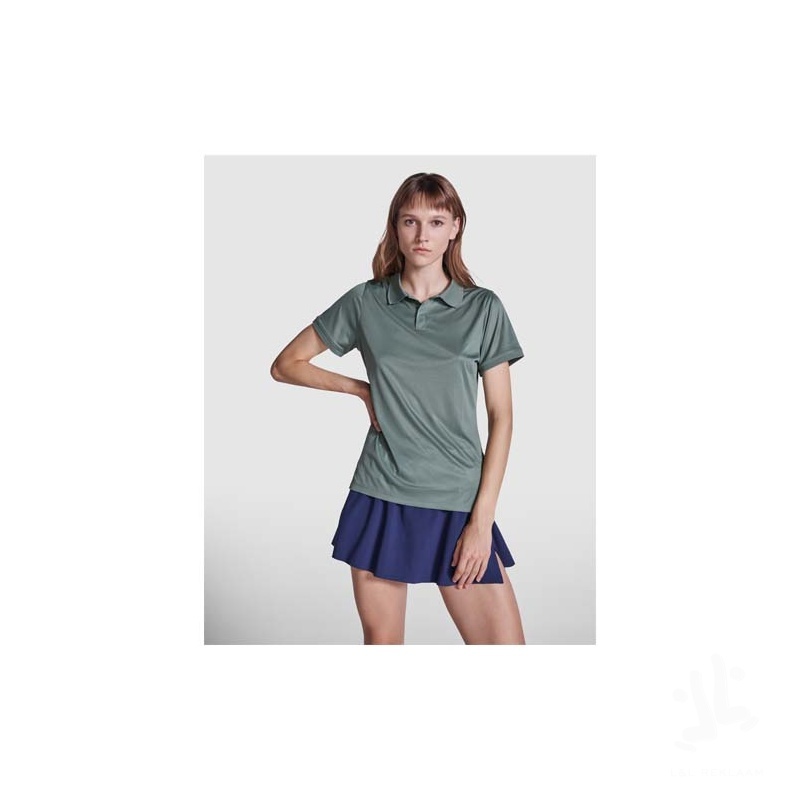 Short-sleeve fitted polo shirt for women. Reinforced covered seams in interior collar. 1x1 ribbed cuffs and collar. Side seams. 3-button placket and side slits.
