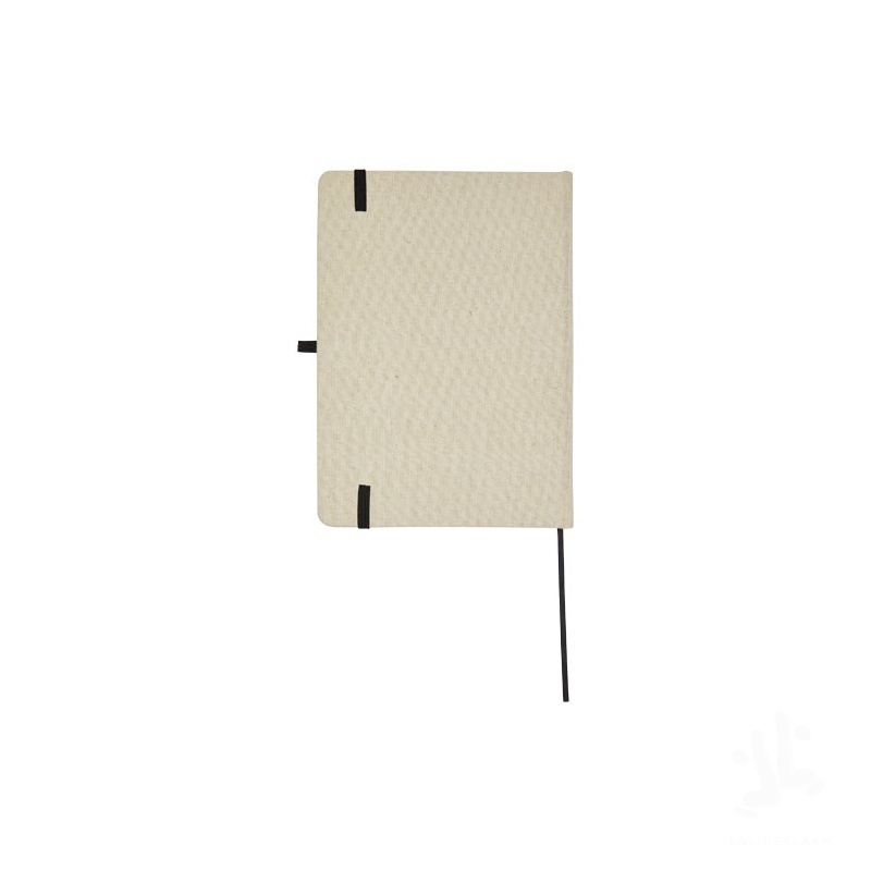 Notebook made from organic cotton with 120 pages of 70 g/m2 recycled white lined paper. Featuring a black ribbon marker, elastic closure, and a pen loop. Organic cotton is grown using sustainable farming practices that help to protect the environment and promote biodiversity. By avoiding the use of harmful chemicals, organic cotton farming can help to reduce soil and water pollution, as well as the risk of health problems for farmers and their families. 80% Organic cotton and 20% Polyester, Recycled paper.