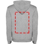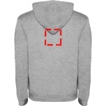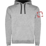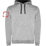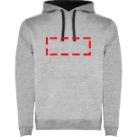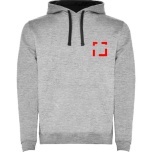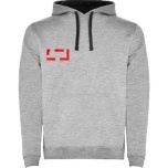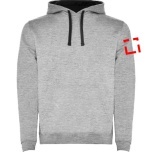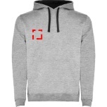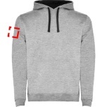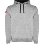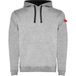 Two-colour hoodie with double fabric. Reinforced covered seams in collar and kangaroo style pocket. 1x1 elastane rib in cuffs and waistband. Removable label. The model is 120 cm and is wearing size 5/6.