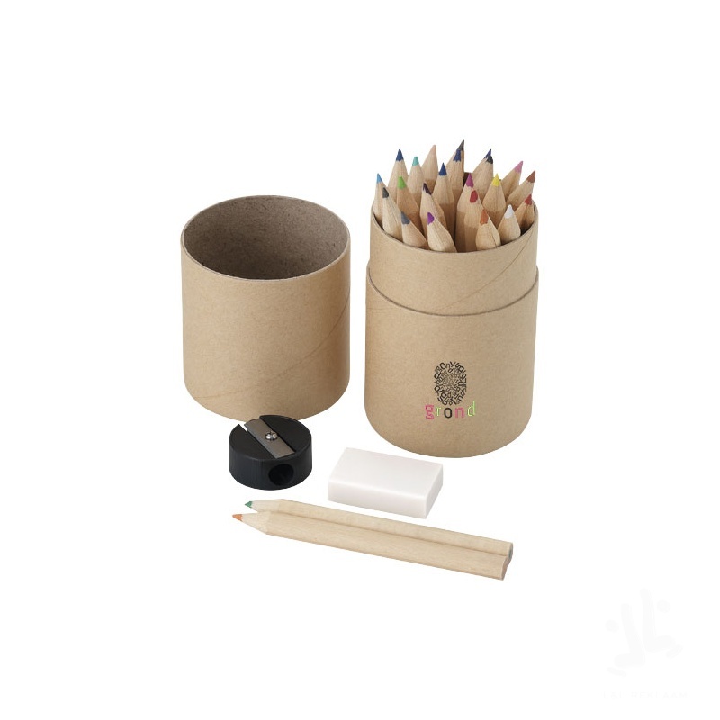 24 värvilist pliiatsit, kustutuskumm ja teritaja silindrilises pappkarbis. Dekoratsioon pole komponentidel saadaval.